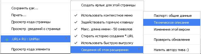 Интерфейсная часть аддона используется для функции создания ярлыка текущей страницы (вкладки) и в контекстном меню страницы во всех линейках представлена единственным пунктом на веб‑страницах: